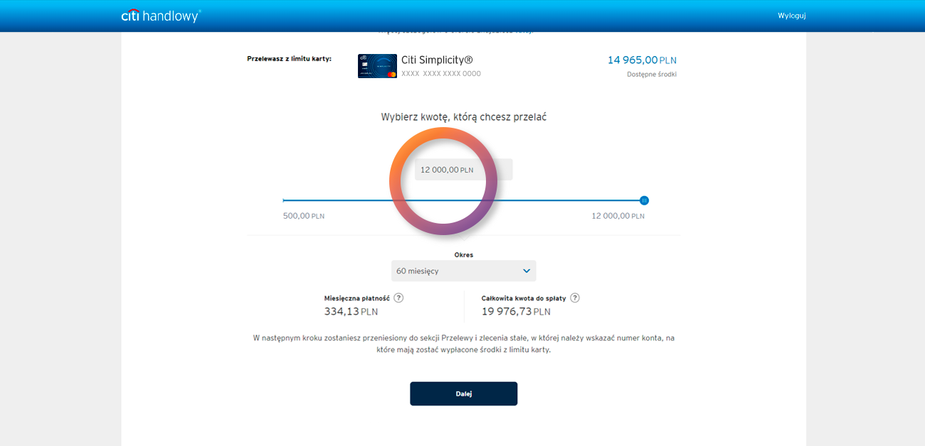 Specify the amount you want to transfer from your credit card and the number of installments to be repaid.