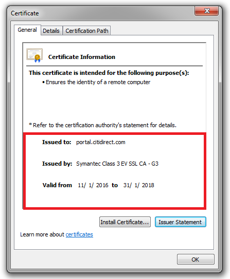 The details of the CitiDirect login page certificate must comply with the following information: