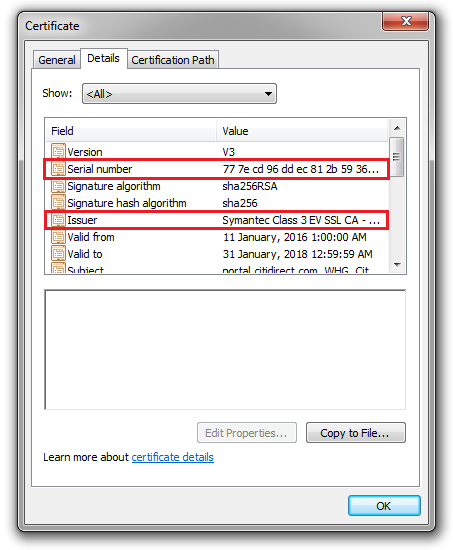 - In "Details” tab check, in particular, if the serial number, issuer