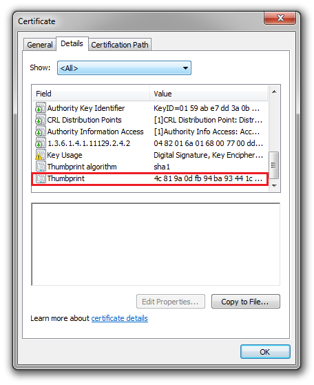 - Thumbprint(SHA1) 4c 81 9a 0d fb 94 ba 93 44 1c 25 68 64 37 16 9e 5b a3 6f e1