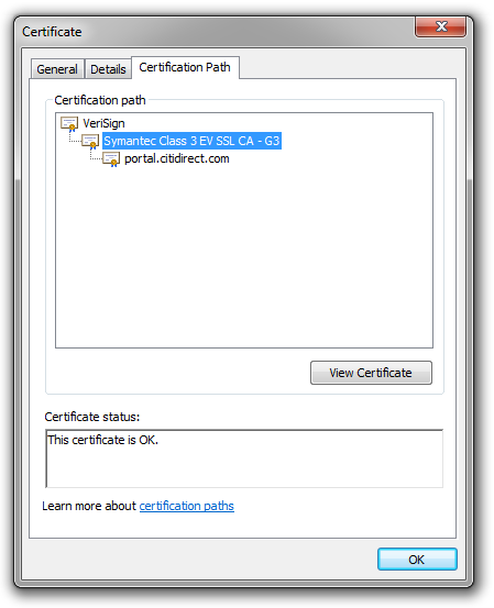 - In "Certification Path” tab check if the certification path is not