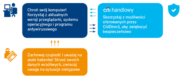 Zwracamy Państwa uwagę na bardzo ważną kwestię bezpieczeństwa związanego z korzystaniem z systemów elektronicznych. System bankowości elektronicznej CitiDirect jest systemem bezpiecznym. Istnieje jednak ryzyko włamania do komputera i sieci po stronie Użytkownika, dlatego przypominamy kilka zasad, dzięki którym Państwa finanse będą jeszcze lepiej zabezpieczone.