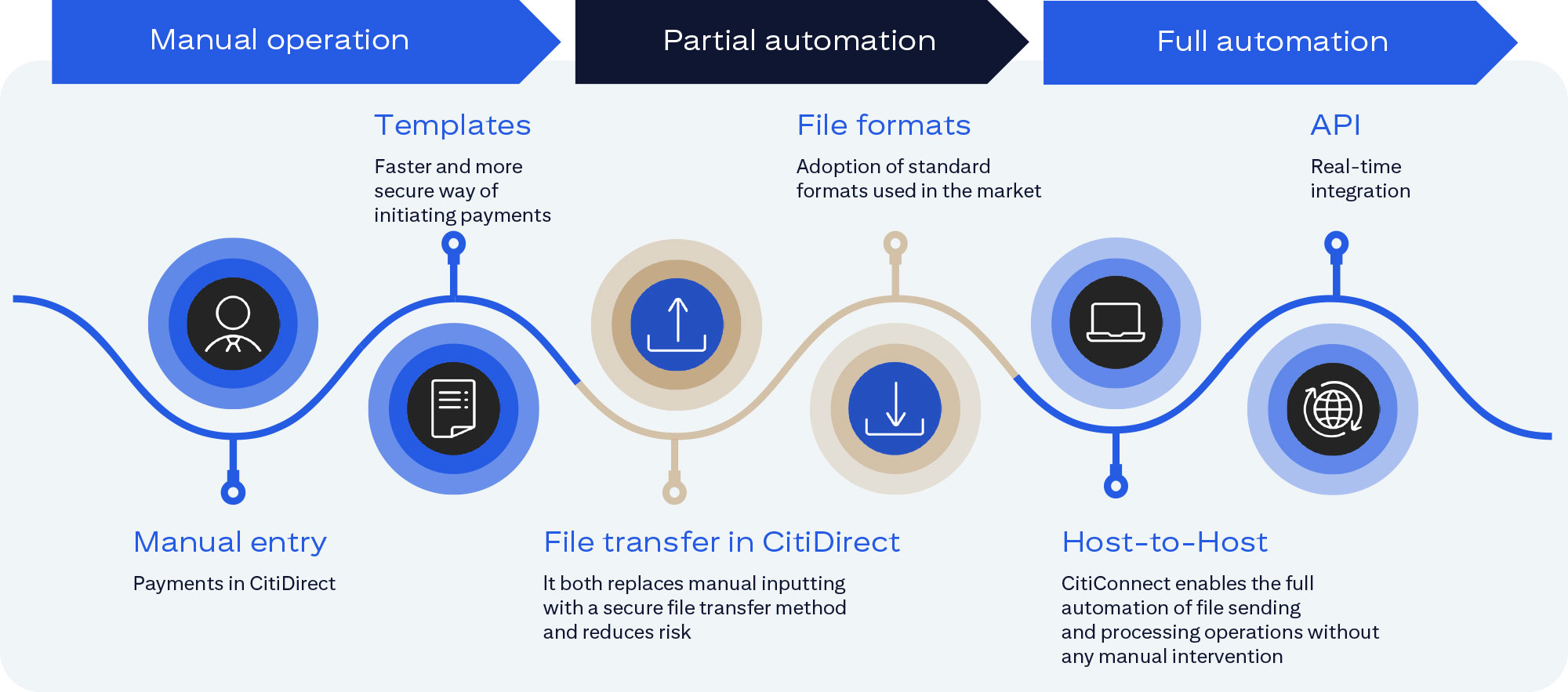 | CitiConnect API | CitiConnect for Files | CitiConnect for SWIFT | CitiDirect | |