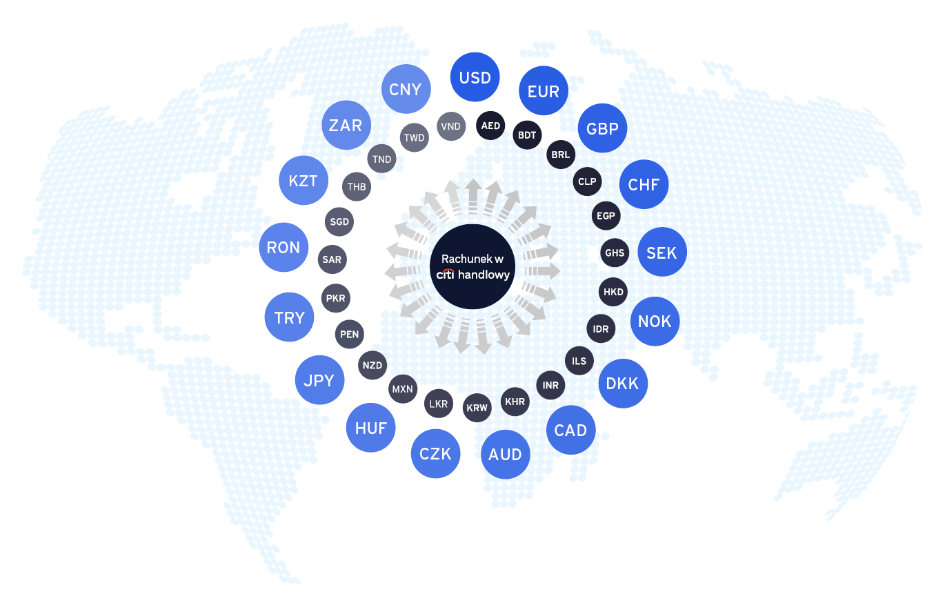 Rachunek Wielowalutowy to prosty sposób na rozliczenia z kontrahentami na całym świecie. Bank Handlowy w Warszawie S.A., działający pod marką Citi Handlowy, wspiera Klientów, którzy prowadzą działalność transgraniczną, planują podbój nowych rynków lub prowadzą międzynarodową wymianę handlową. Oferujemy możliwość realizacji płatności w ponad 140 walutach zagranicznych bezpośrednio z rachunku prowadzonego w PLN, USD lub EUR.